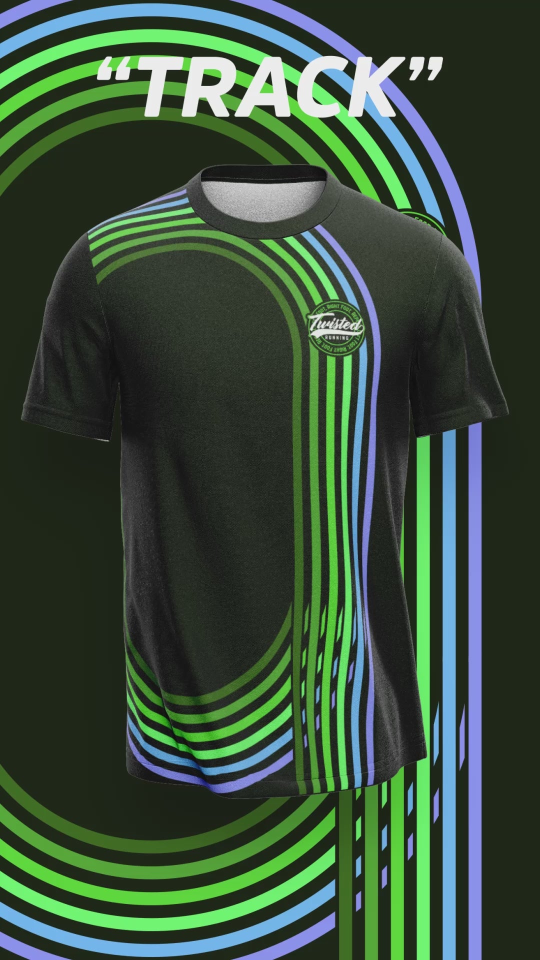 Get ready to turn heads with the striking Twisted Running “Track” T-Shirt in Black, Green, and Blue. Made for performance, this tee features ultra-lightweight polyester designed to keep you cool even during your most challenging runs. The vibrant green and blue track lines pop against the black background, creating a bold yet dynamic look that stands out from the pack. Designed to fit close to the body, this race-spec tee moves with you, reducing friction and maximizing comfort.